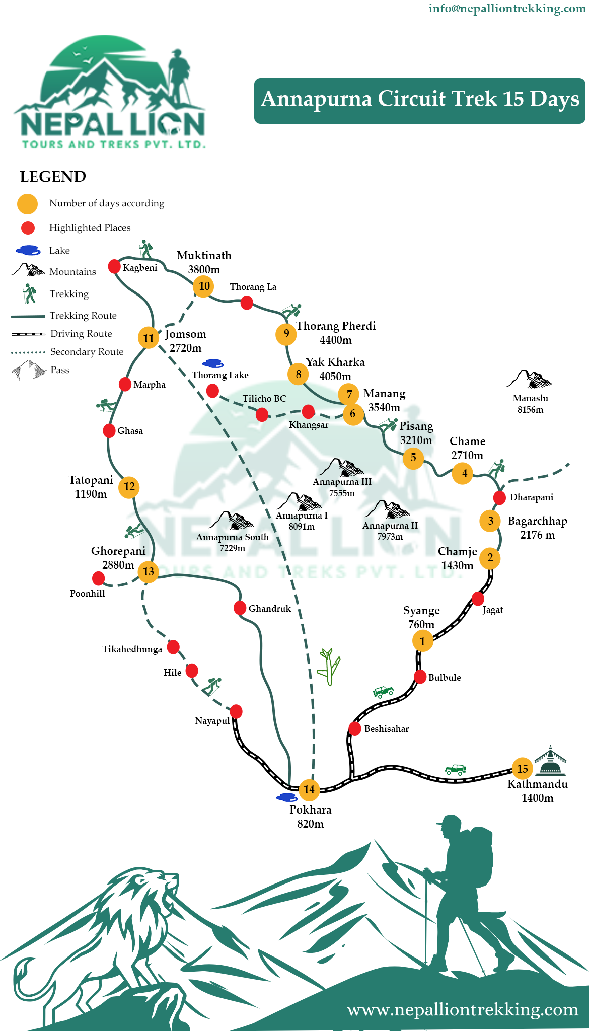 This 15-day plan includes an acclimatization day in Manang (3,540m) before going higher. Shorter trekking days before Thorong La also help your body adapt.