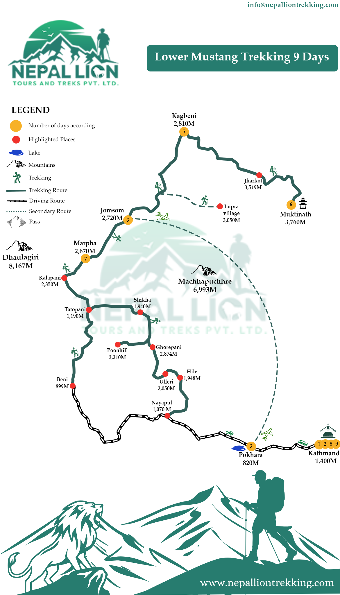Most itineraries start with a drive or flight from Pokhara to Jomsom, followed by trekking.