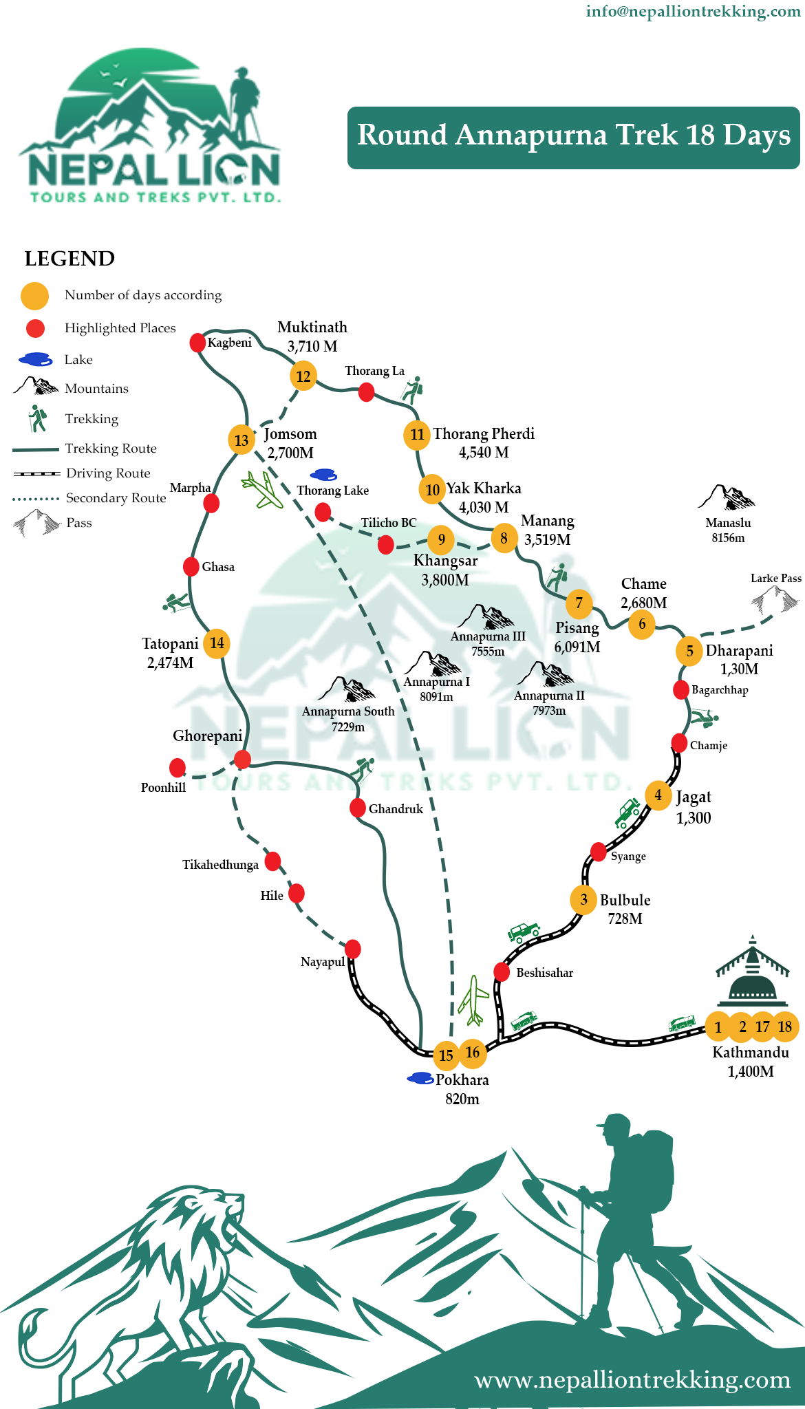 The trek begins with a drive to Besisahar, then follows the circuit, crosses the high Thorong La Pass, and descends into the Mustang region.